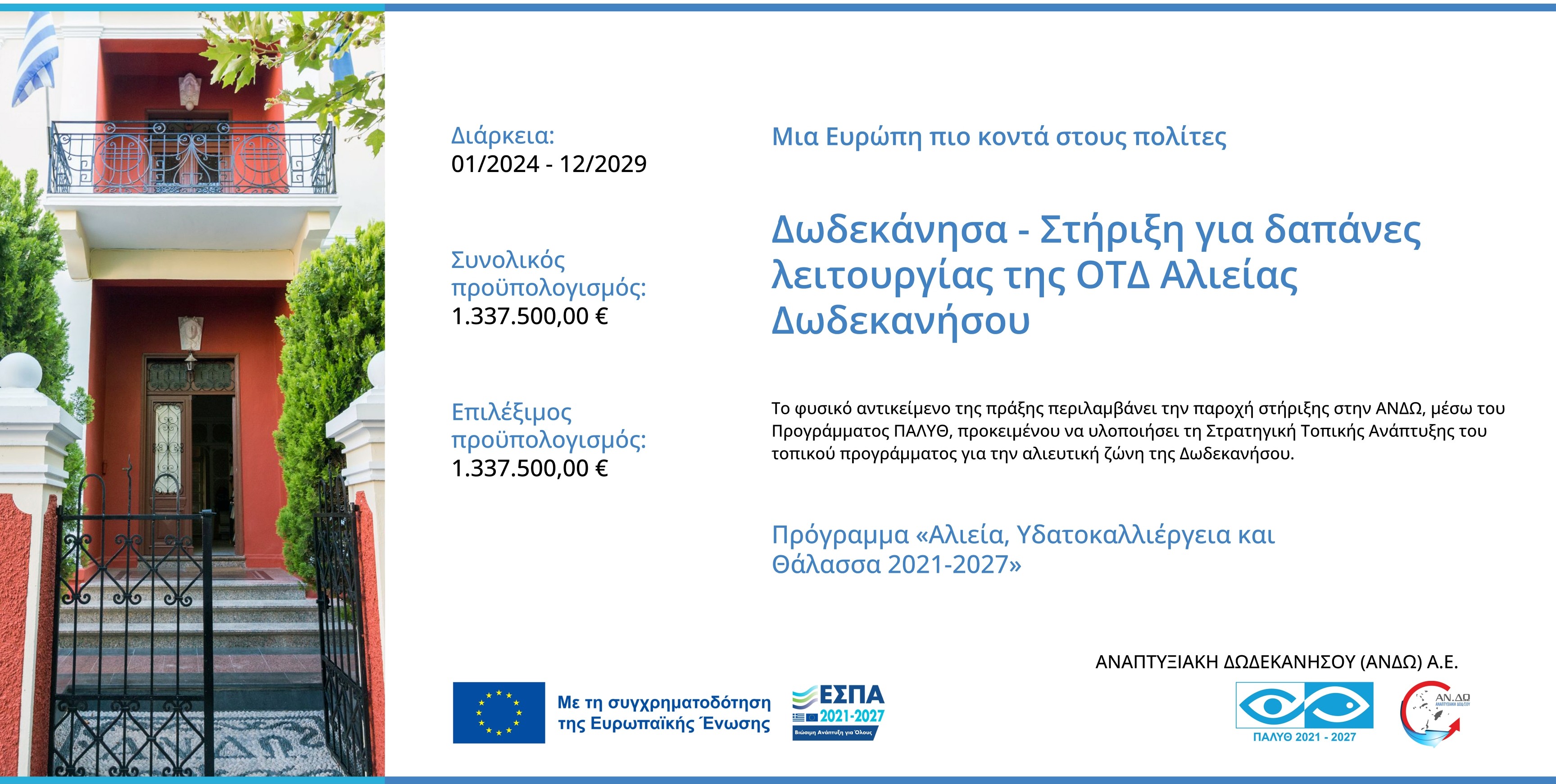 ΤΙΤΛΟΣ ΠΡΑΞΗΣ: «Δωδεκάνησα – Στήριξη για δαπάνες λειτουργίας και συντονισμού της ΑΝΔΩ ΑΕ ως ΟΤΔ Αλιείας για την υλοποίηση της στρατηγικής τοπικής ανάπτυξης Δωδεκανήσου»